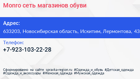 Monro, сеть магазинов обуви по адресу 633203, Новосибирская область, Искитим, Лермонтова, 43 в дальнейшем Организация, размещена в следующих категориях: