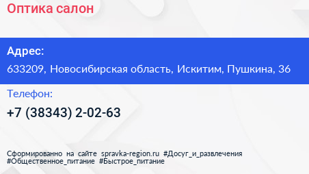 Оптика, салон по адресу 633209, Новосибирская область, Искитим, Пушкина, 36 в дальнейшем Организация, размещена в следующих категориях: