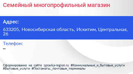 Семейный, многопрофильный магазин по адресу 633205, Новосибирская область, Искитим, Центральная, 26 в дальнейшем Организация, размещена в следующих категориях:
