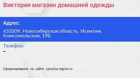 Виктория, магазин домашней одежды по адресу 633209, Новосибирская область, Искитим, Комсомольская, 19Б в дальнейшем Организация, размещена в следующих категориях: