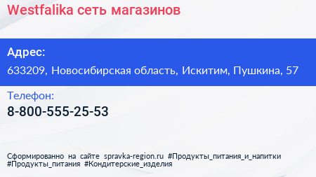 Westfalika, сеть магазинов по адресу 633209, Новосибирская область, Искитим, Пушкина, 57 в дальнейшем Организация, размещена в следующих категориях: