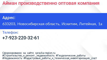 Айман, производственно-оптовая компания по адресу 633203, Новосибирская область, Искитим, Литейная, 1а в дальнейшем Организация, размещена в следующих категориях: