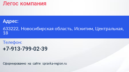 Легос, компания по адресу 633222, Новосибирская область, Искитим, Центральная, 18 в дальнейшем Организация, размещена в следующих категориях: