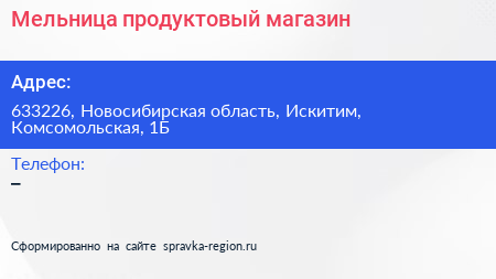 Мельница, продуктовый магазин по адресу 633226, Новосибирская область, Искитим, Комсомольская, 1Б в дальнейшем Организация, размещена в следующих категориях: