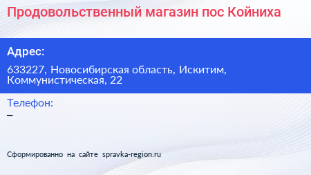 Продовольственный магазин, пос. Койниха по адресу 633227, Новосибирская область, Искитим, Коммунистическая, 22 в дальнейшем Организация, размещена в следующих категориях: