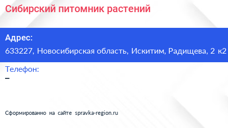 Сибирский питомник растений по адресу 633227, Новосибирская область, Искитим, Радищева, 2 к2 в дальнейшем Организация, размещена в следующих категориях: