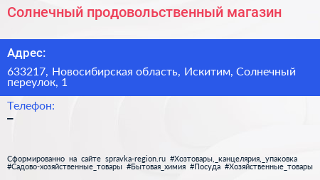 Солнечный, продовольственный магазин по адресу 633217, Новосибирская область, Искитим, Солнечный переулок, 1 в дальнейшем Организация, размещена в следующих категориях: