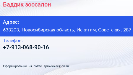 Баддик, зоосалон по адресу 633203, Новосибирская область, Искитим, Советская, 287 в дальнейшем Организация, размещена в следующих категориях: