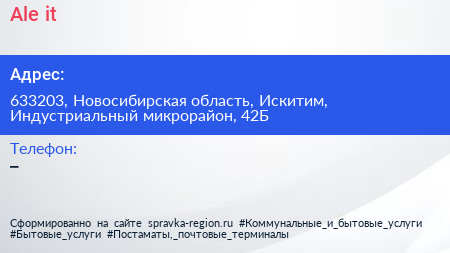 Ale it по адресу 633203, Новосибирская область, Искитим, Индустриальный микрорайон, 42Б в дальнейшем Организация, размещена в следующих категориях: