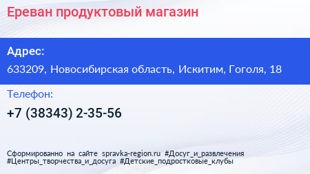 Ереван, продуктовый магазин по адресу 633209, Новосибирская область, Искитим, Гоголя, 18 в дальнейшем Организация, размещена в следующих категориях: