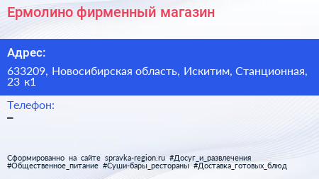 Ермолино, фирменный магазин по адресу 633209, Новосибирская область, Искитим, Станционная, 23 к1 в дальнейшем Организация, размещена в следующих категориях: