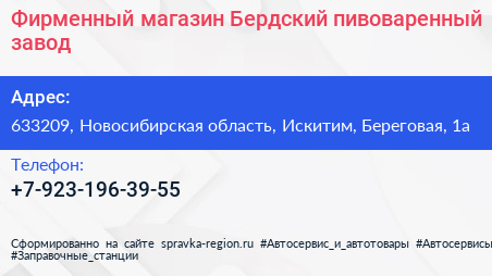 Фирменный магазин, Бердский пивоваренный завод по адресу 633209, Новосибирская область, Искитим, Береговая, 1а в дальнейшем Организация, размещена в следующих категориях: