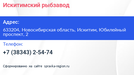 Искитимский рыбзавод по адресу 633204, Новосибирская область, Искитим, Юбилейный проспект, 2 в дальнейшем Организация, размещена в следующих категориях: