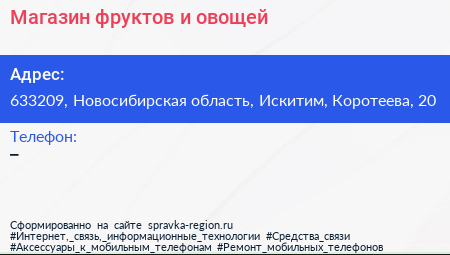 Магазин фруктов и овощей по адресу 633209, Новосибирская область, Искитим, Коротеева, 20 в дальнейшем Организация, размещена в следующих категориях:
