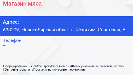 Магазин мяса по адресу 633209, Новосибирская область, Искитим, Советская, 6 в дальнейшем Организация, размещена в следующих категориях: