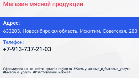 Магазин мясной продукции по адресу 633203, Новосибирская область, Искитим, Советская, 283 в дальнейшем Организация, размещена в следующих категориях: