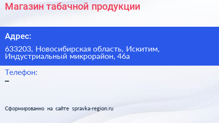 Магазин табачной продукции по адресу 633203, Новосибирская область, Искитим, Индустриальный микрорайон, 46а в дальнейшем Организация, размещена в следующих категориях: