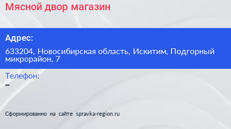 Мясной двор, магазин по адресу 633204, Новосибирская область, Искитим, Подгорный микрорайон, 7 в дальнейшем Организация, размещена в следующих категориях: