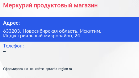 Меркурий, продуктовый магазин по адресу 633203, Новосибирская область, Искитим, Индустриальный микрорайон, 24 в дальнейшем Организация, размещена в следующих категориях: