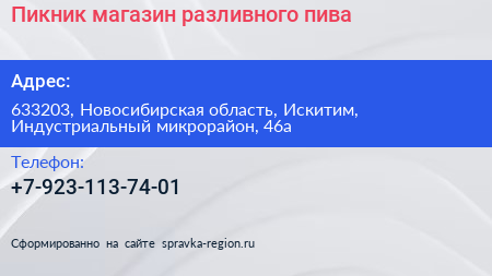 Пикник, магазин разливного пива по адресу 633203, Новосибирская область, Искитим, Индустриальный микрорайон, 46а в дальнейшем Организация, размещена в следующих категориях: