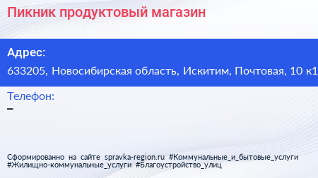 Пикник, продуктовый магазин по адресу 633205, Новосибирская область, Искитим, Почтовая, 10 к1 в дальнейшем Организация, размещена в следующих категориях: