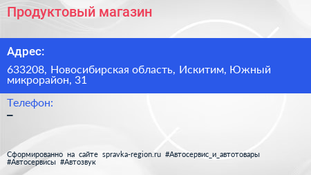 Продуктовый магазин по адресу 633208, Новосибирская область, Искитим, Южный микрорайон, 31 в дальнейшем Организация, размещена в следующих категориях: