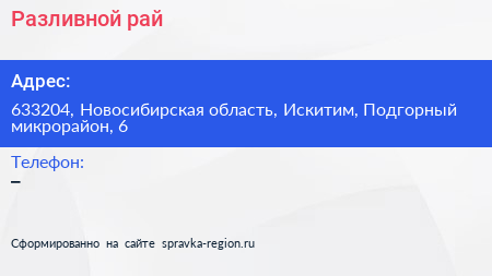 Разливной рай по адресу 633204, Новосибирская область, Искитим, Подгорный микрорайон, 6 в дальнейшем Организация, размещена в следующих категориях: