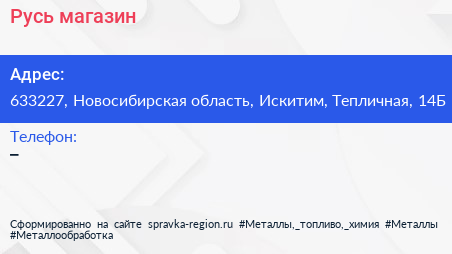 Русь, магазин по адресу 633227, Новосибирская область, Искитим, Тепличная, 14Б в дальнейшем Организация, размещена в следующих категориях:
