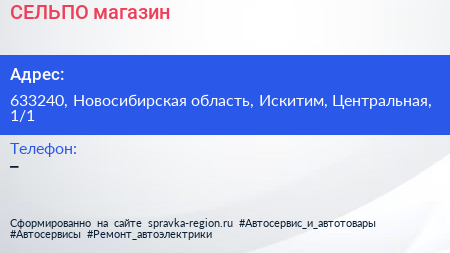 СЕЛЬПО, магазин по адресу 633240, Новосибирская область, Искитим, Центральная, 1/1 в дальнейшем Организация, размещена в следующих категориях:
