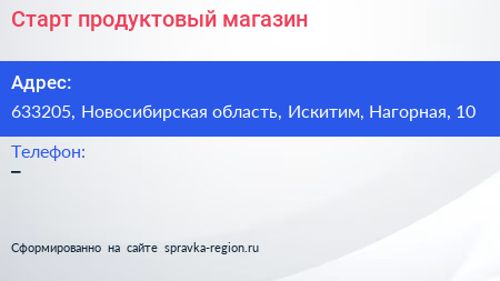 Старт, продуктовый магазин по адресу 633205, Новосибирская область, Искитим, Нагорная, 10 в дальнейшем Организация, размещена в следующих категориях: