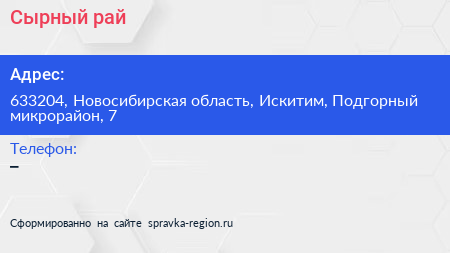 Сырный рай по адресу 633204, Новосибирская область, Искитим, Подгорный микрорайон, 7 в дальнейшем Организация, размещена в следующих категориях: