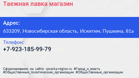 Таежная лавка, магазин по адресу 633209, Новосибирская область, Искитим, Пушкина, 81а в дальнейшем Организация, размещена в следующих категориях: