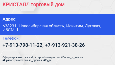 КРИСТАЛЛ, торговый дом по адресу 633231, Новосибирская область, Искитим, Луговая, ИЗСМ-1 в дальнейшем Организация, размещена в следующих категориях: