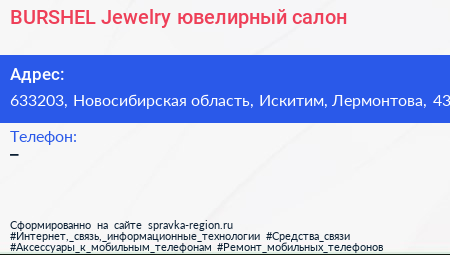 BURSHEL Jewelry, ювелирный салон по адресу 633203, Новосибирская область, Искитим, Лермонтова, 43 в дальнейшем Организация, размещена в следующих категориях: