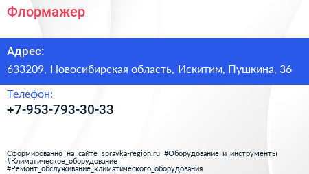 Флормажер по адресу 633209, Новосибирская область, Искитим, Пушкина, 36 в дальнейшем Организация, размещена в следующих категориях: