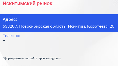 Искитимский рынок по адресу 633209, Новосибирская область, Искитим, Коротеева, 20 в дальнейшем Организация, размещена в следующих категориях: