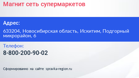 Магнит, сеть супермаркетов по адресу 633204, Новосибирская область, Искитим, Подгорный микрорайон, 6 в дальнейшем Организация, размещена в следующих категориях: