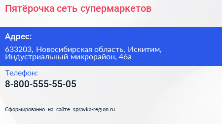 Пятёрочка, сеть супермаркетов по адресу 633203, Новосибирская область, Искитим, Индустриальный микрорайон, 46а в дальнейшем Организация, размещена в следующих категориях: