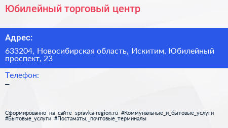 Юбилейный, торговый центр по адресу 633204, Новосибирская область, Искитим, Юбилейный проспект, 23 в дальнейшем Организация, размещена в следующих категориях: