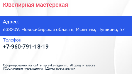 Ювелирная мастерская по адресу 633209, Новосибирская область, Искитим, Пушкина, 57 в дальнейшем Организация, размещена в следующих категориях: