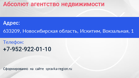 Абсолют, агентство недвижимости по адресу 633209, Новосибирская область, Искитим, Вокзальная, 1 в дальнейшем Организация, размещена в следующих категориях: