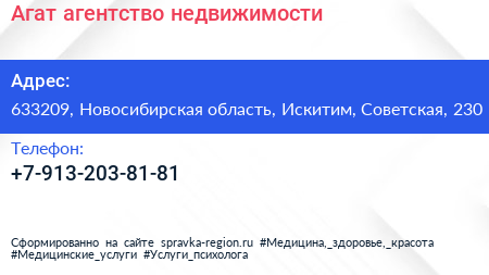 Агат, агентство недвижимости по адресу 633209, Новосибирская область, Искитим, Советская, 230 в дальнейшем Организация, размещена в следующих категориях: