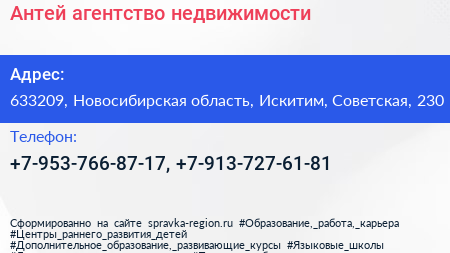 Антей, агентство недвижимости по адресу 633209, Новосибирская область, Искитим, Советская, 230 в дальнейшем Организация, размещена в следующих категориях: