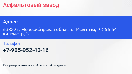 Асфальтовый завод по адресу 633227, Новосибирская область, Искитим, Р-256 54 километр, 3 в дальнейшем Организация, размещена в следующих категориях: