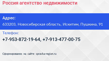 Россия, агентство недвижимости по адресу 633203, Новосибирская область, Искитим, Пушкина, 91 в дальнейшем Организация, размещена в следующих категориях:
