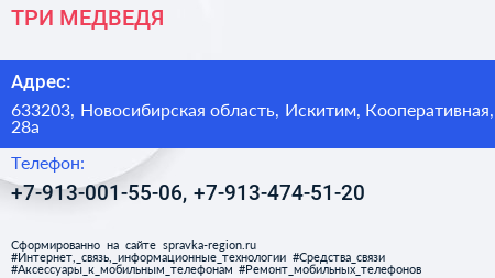 ТРИ МЕДВЕДЯ по адресу 633203, Новосибирская область, Искитим, Кооперативная, 28а в дальнейшем Организация, размещена в следующих категориях: