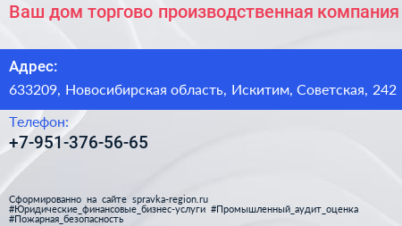 Ваш дом, торгово-производственная компания по адресу 633209, Новосибирская область, Искитим, Советская, 242 в дальнейшем Организация, размещена в следующих категориях: