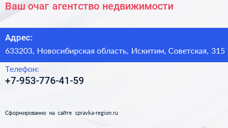 Ваш очаг, агентство недвижимости по адресу 633203, Новосибирская область, Искитим, Советская, 315 в дальнейшем Организация, размещена в следующих категориях: