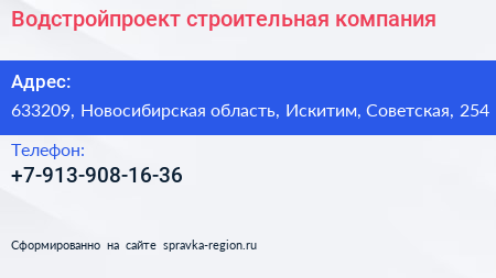 Водстройпроект, строительная компания по адресу 633209, Новосибирская область, Искитим, Советская, 254 в дальнейшем Организация, размещена в следующих категориях:
