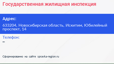 Государственная жилищная инспекция по адресу 633204, Новосибирская область, Искитим, Юбилейный проспект, 14 в дальнейшем Организация, размещена в следующих категориях: